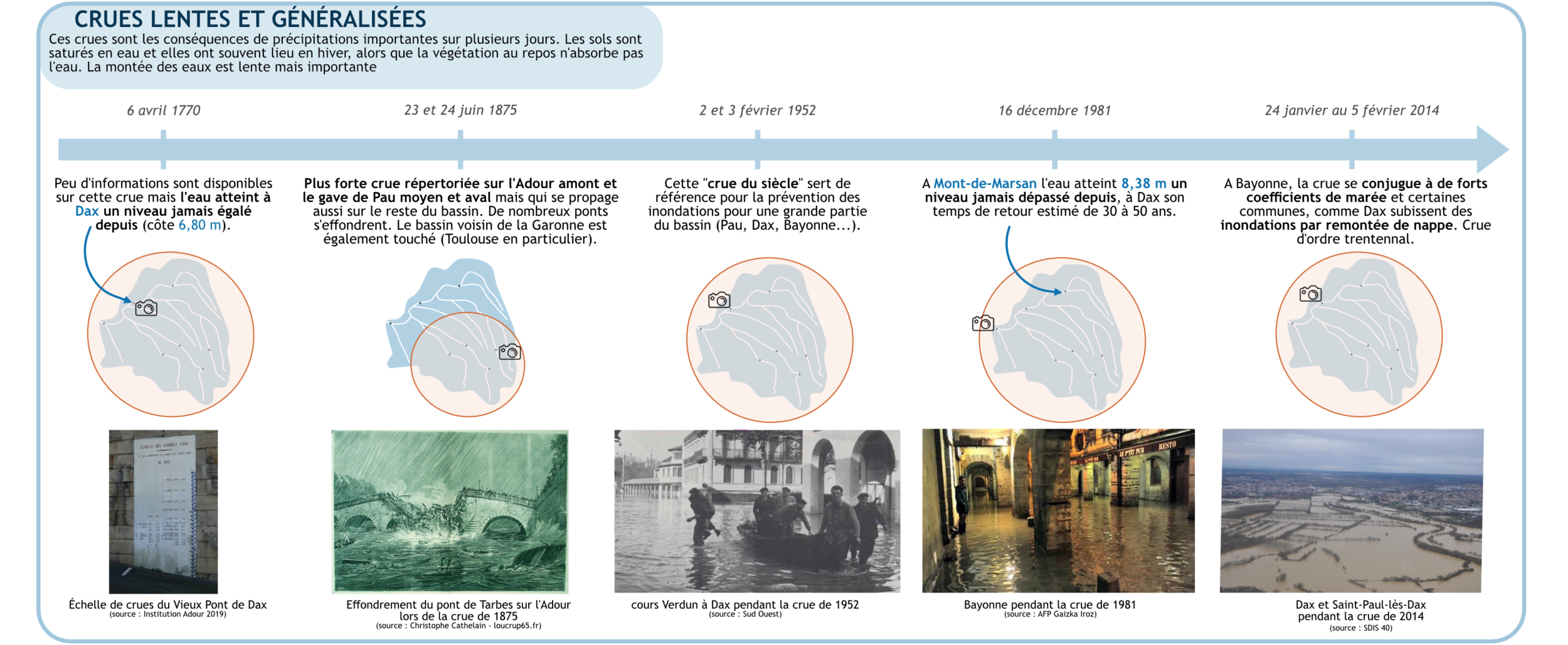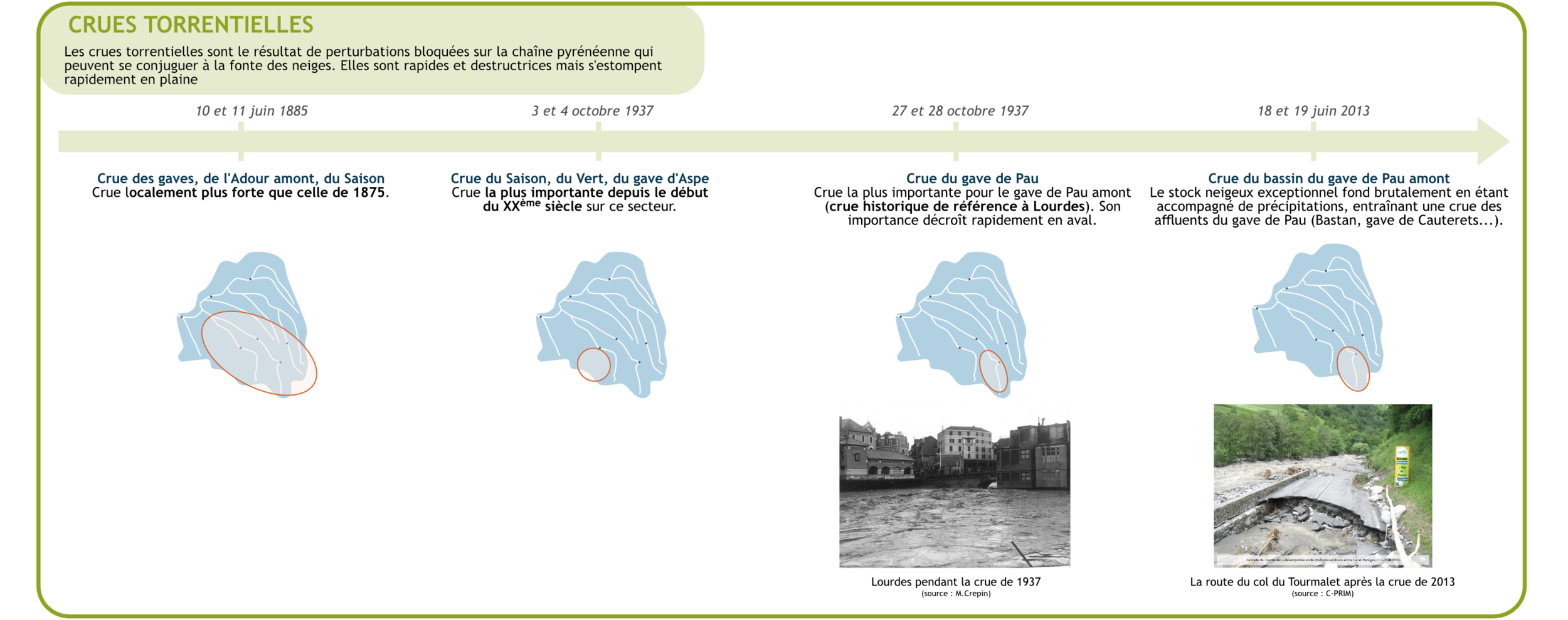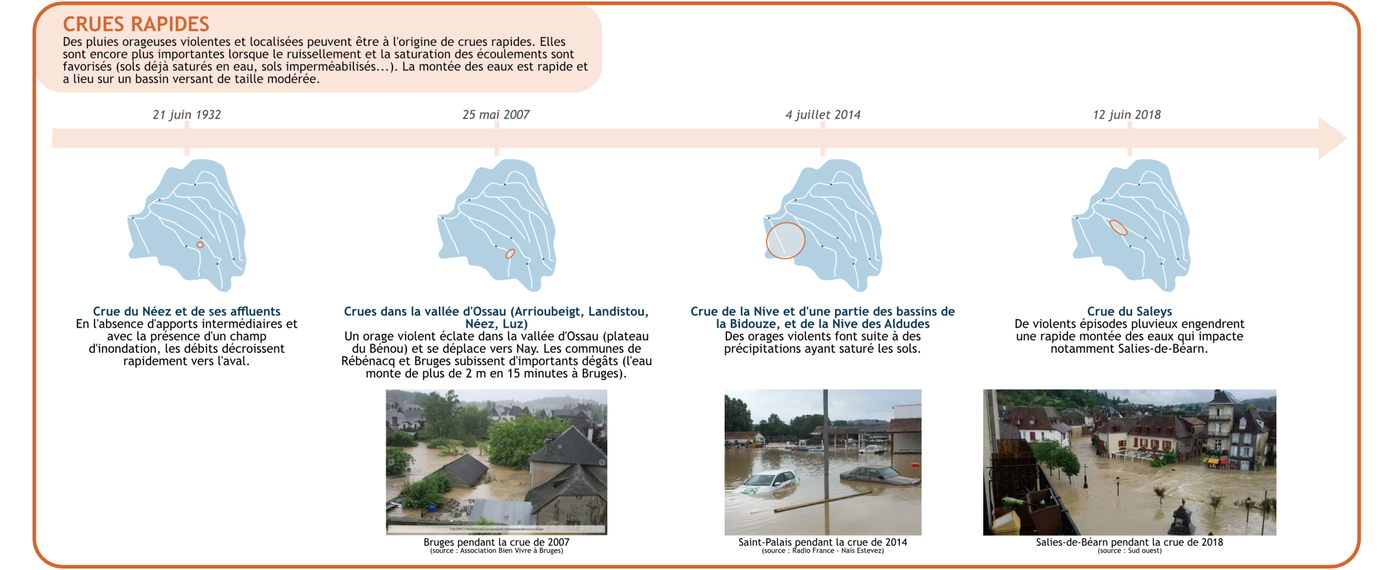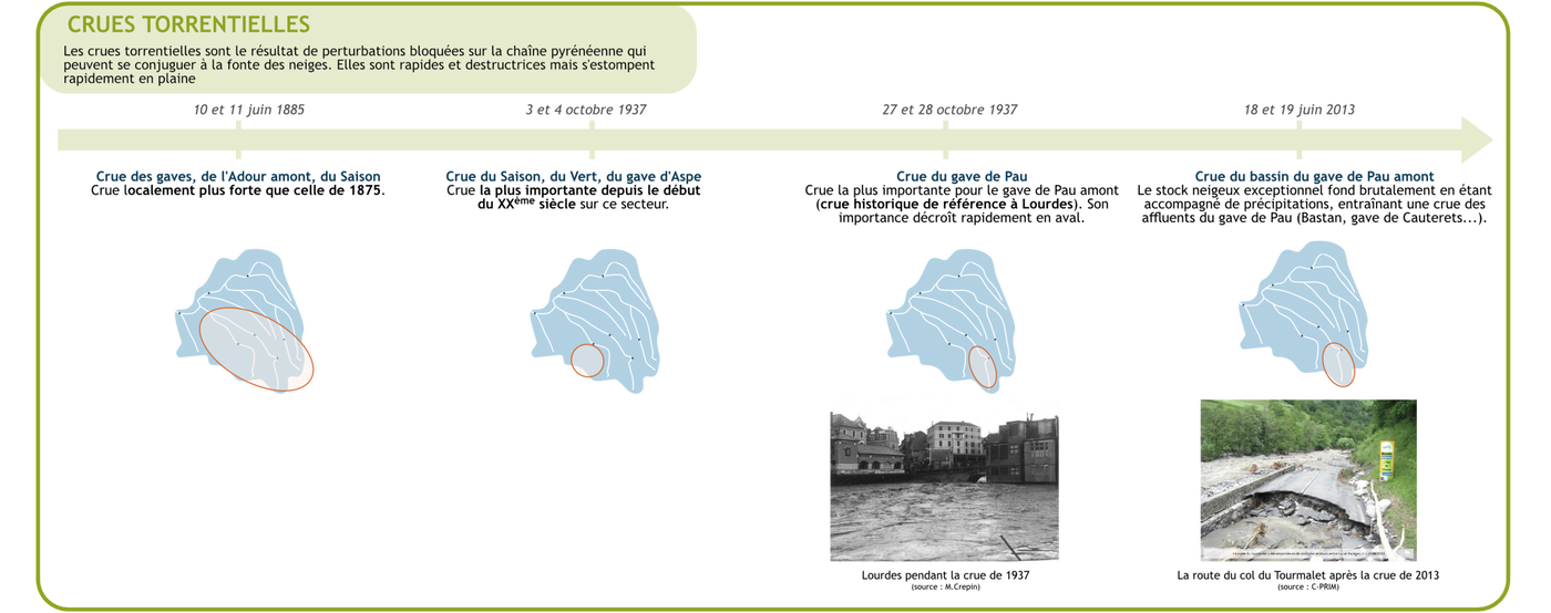 Les exemples de crues exposés précédemment et les informations associées proviennent également de l’évaluation préliminaire des risques d’inondation (EPRI) et de diverses autres sources parmi lesquelles le centre pyrénéen des risques majeurs (C-PRIM), les PPRI et PAPI des territoires concernés...