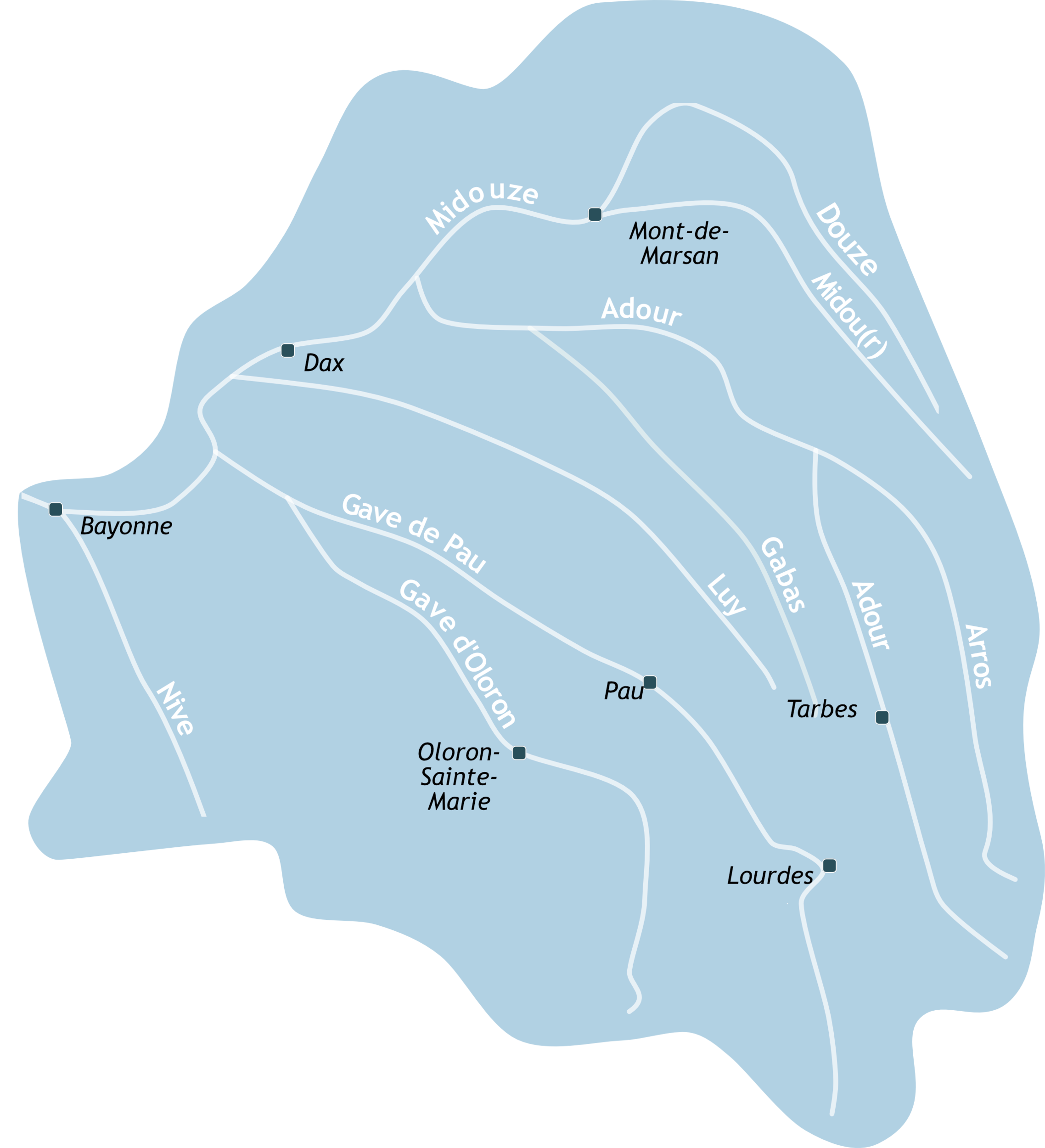 Les périmètres touchés par les crues, les lieux prises de vues et des niveaux sont signalés sur des cartes schématiques du bassin de l'Adour. Les villes et les cours d'eau principaux sont localisés sur l"image ci-contre (un clic sur l'image permet de l'afficher en grand).