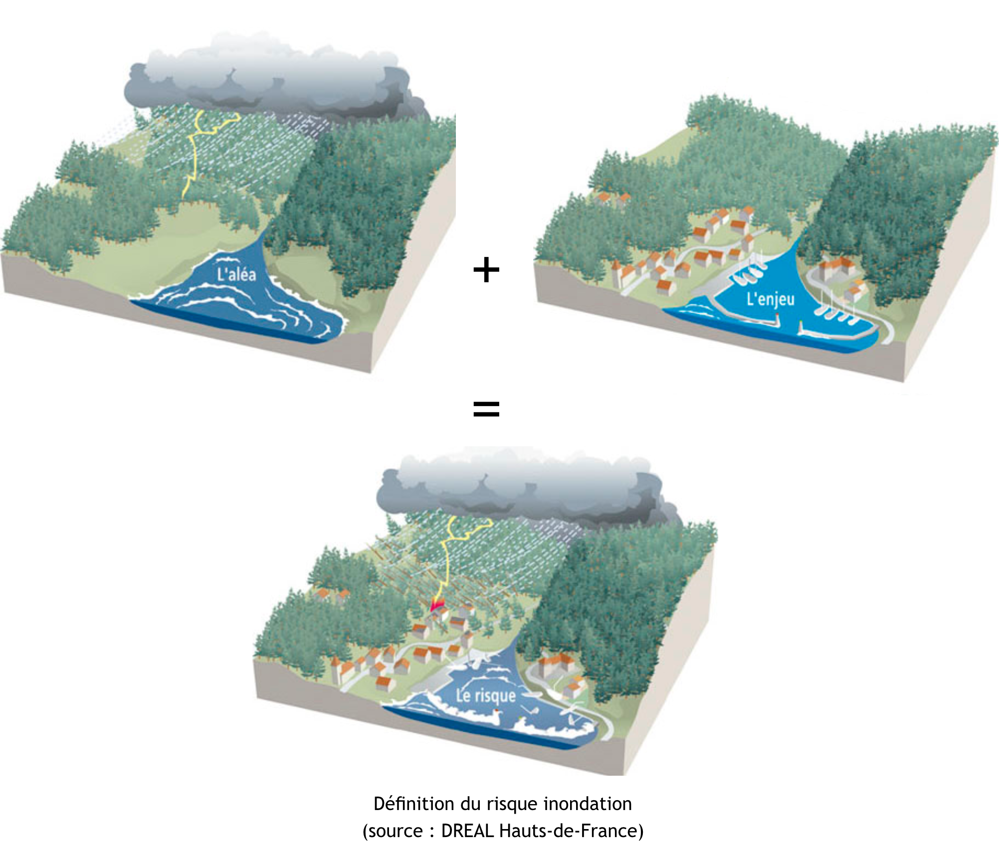 Le risque se définit par la probabilité d'un évènement dommageable lié à l'exposition d'enjeux face à un aléa. L'aléa est un phénomène (naturel ou technologique) plus ou moins probable. Il est à ne pas confondre avec le risque, qui n'existerait pas sans la présence d'une vulnérabilité. La vulnérabilité est la fragilité d'un enjeu (population, activité, constructions,...) face à l'aléa. En l'absence d'enjeu, il n'y a pas de risque.