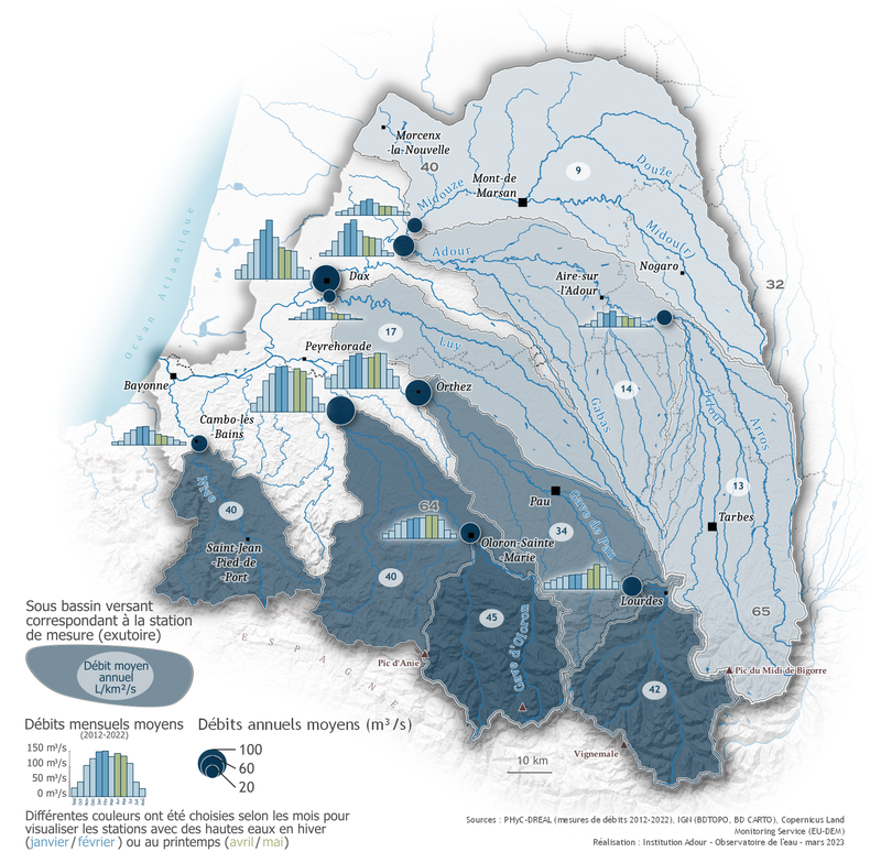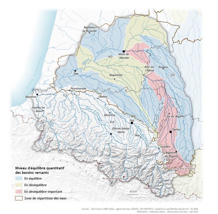 Les ressources en eau superficielles présentent également des déficits quantitatifs. Certains bassins (cours d'eau et nappes d'accompagnement) ont même été classés en déséquilibre au regard de la ressource en eau disponible par rapport aux besoins de prélèvements dans le SDAGE (cf. carte ci-dessous). Cela s'observe en particulier l'été, qui se caractérise par une diminution générale des débits des cours d'eau, en particulier sur les bassins versants amont de l'Adour, des Luys et les bassins amont de la Midouze. L'étiage sur les gaves est moins marqué. Cette baisse des débits est telle qu'elle peut amener jusqu'à des écoulements non visibles voire des assecs sur les petits affluents (suivi du réseau ONDE).