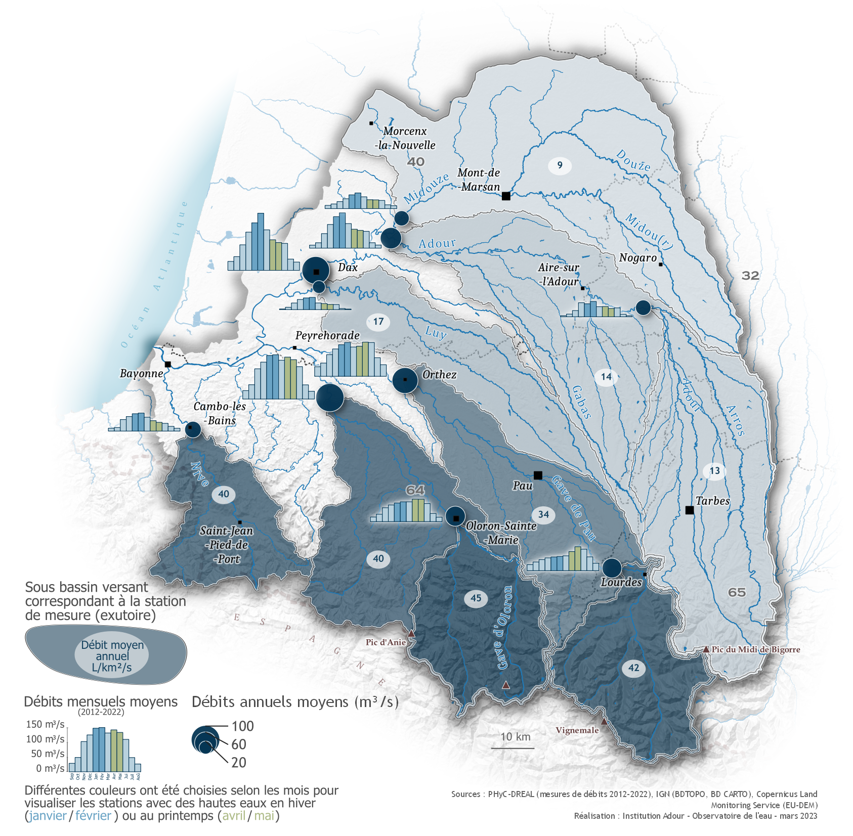 L’influence pyrénéenne se traduit aussi dans les variations annuelles de débits. En hiver, l'eau est stockée en montagne sous forme de neige jusqu'à la fonte au printemps, tandis qu'en plaine, les pluies alimentent directement les cours d'eau. Les périodes de hautes eaux diffèrent donc, et les régimes de cours d'eau sont qualifiés selon les précipitations qui influencent le plus leur débit : pluvial, pluvio-nival, nival...