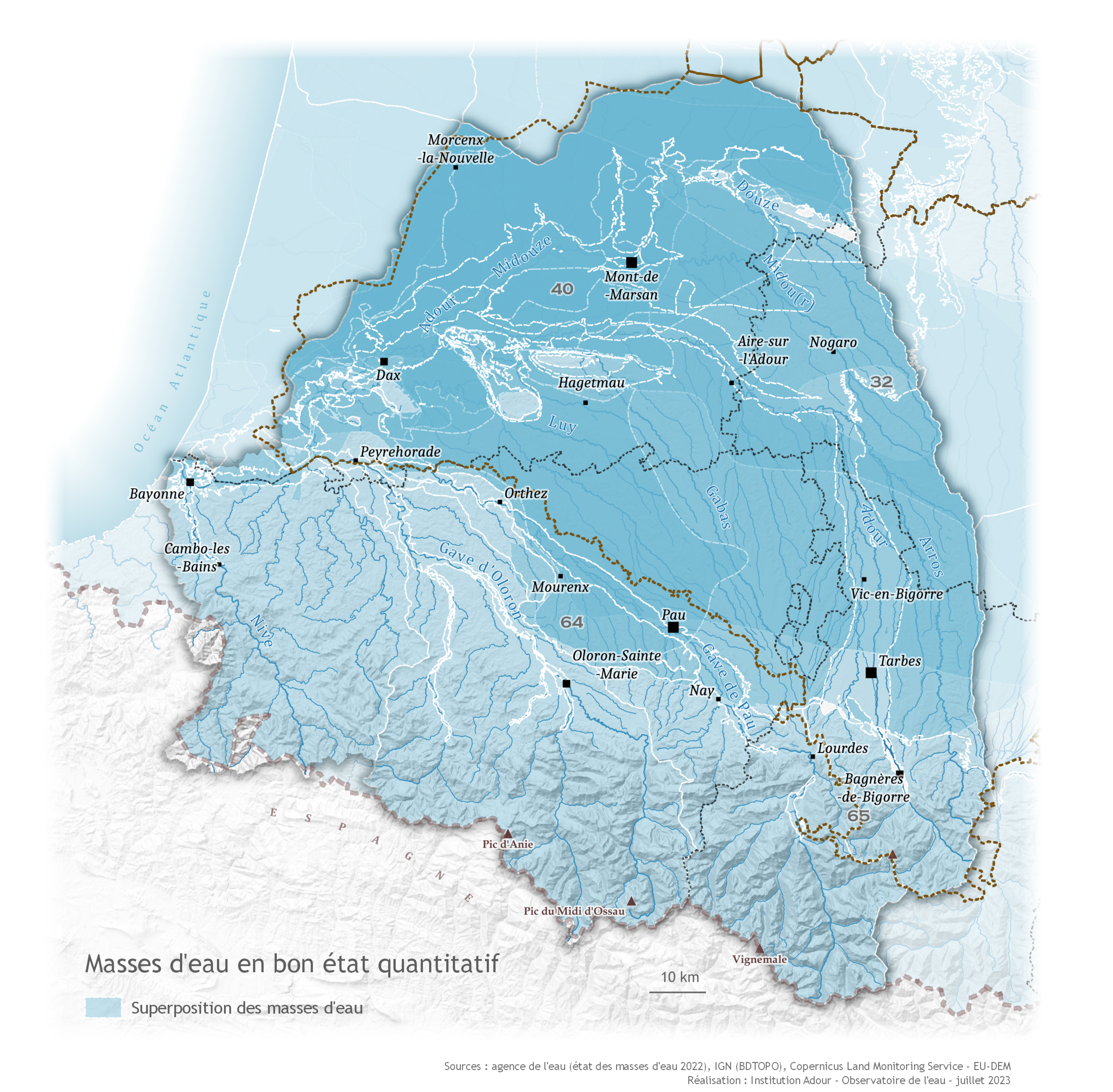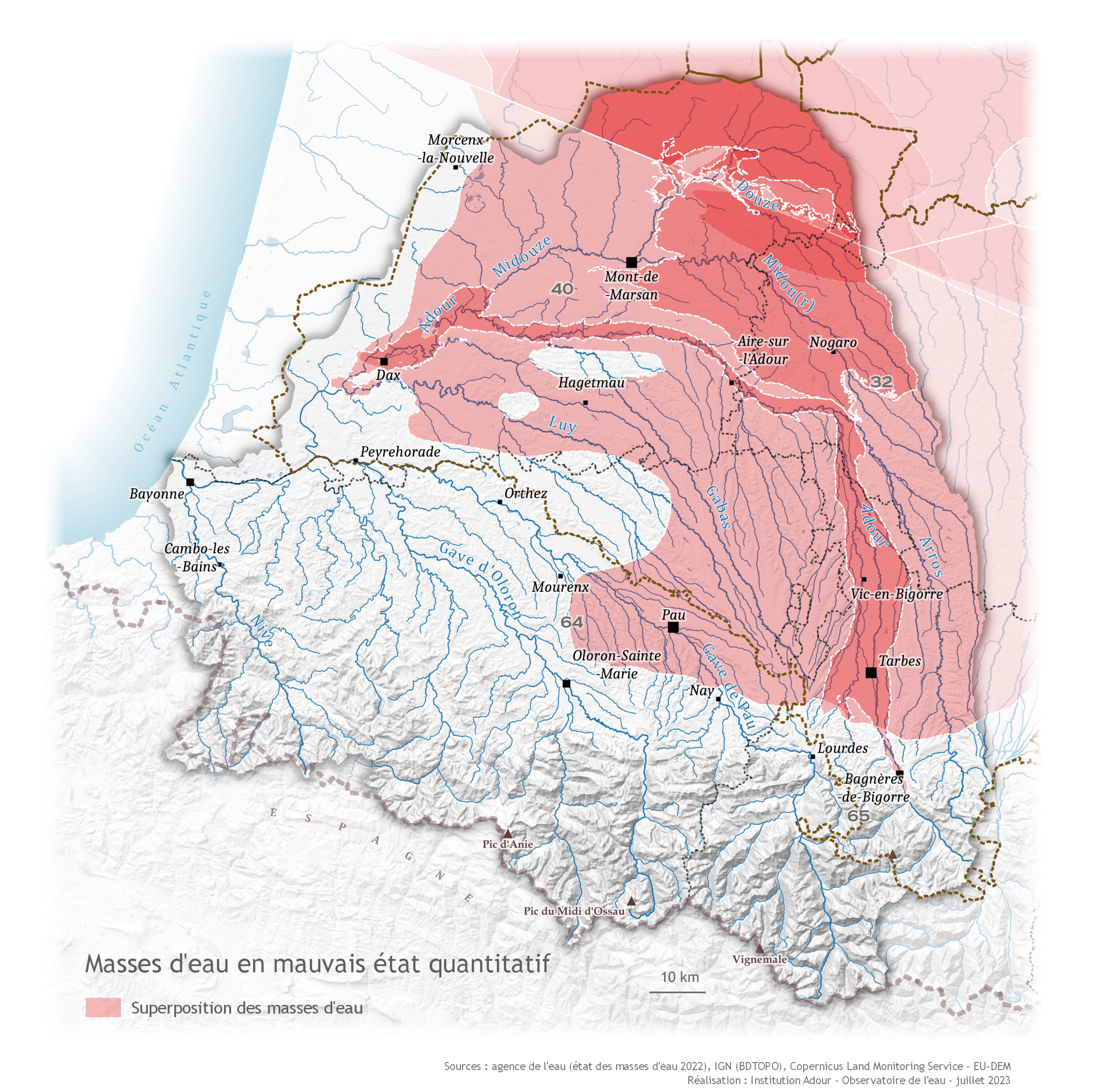 Parmi les masses d'eau en mauvais état quantitatif, on note les alluvions de l'Adour, nappe libre principalement utilisée pour l'irrigation et dont la pression de prélèvement est significative. Les sables et grès de l'Eocène inférieur et moyen majoritairement captifs du sud-ouest et nord du bassin aquitanien sont également en mauvais état quantitatif, avec une pression significative des prélèvements réalisés pour l'alimentation en eau potable.
