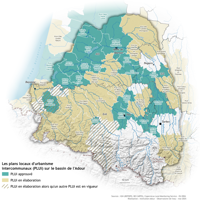 Sur le bassin de l’Adour, plus des deux tiers des collectivités sont concernées par des PLUi, qu’ils soient en cours d’élaboration ou approuvés. L’intérêt d’établir ce type de démarche à l’échelle intercommunale est d’aborder les enjeux à une échelle plus pertinente (bassin de vie), d’autant que la compétence PLU revient désormais aux EPCI-FP.