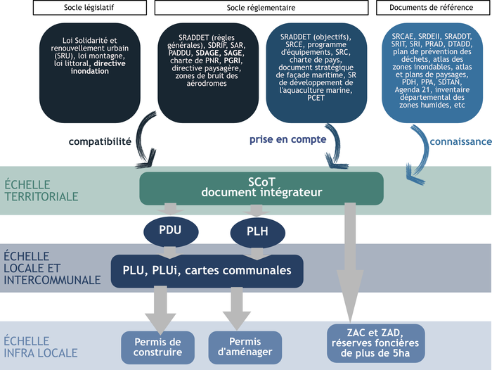 Le SCoT dispose d'un rôle intégrateur par rapport à ces documents-cadre d’ordre supérieur. Ainsi, la compatibilité des documents d’urbanisme locaux (PLU, cartes communales) avec le SCoT en vigueur (obligatoire depuis la loi dite « Grenelle » de 2010) permet d’assurer l'intégration des enjeux eau à l’échelle locale. En l’absence de SCoT, c’est directement le document d’urbanisme (PLU, carte communale) qui doit prendre en considération ces documents-cadre.