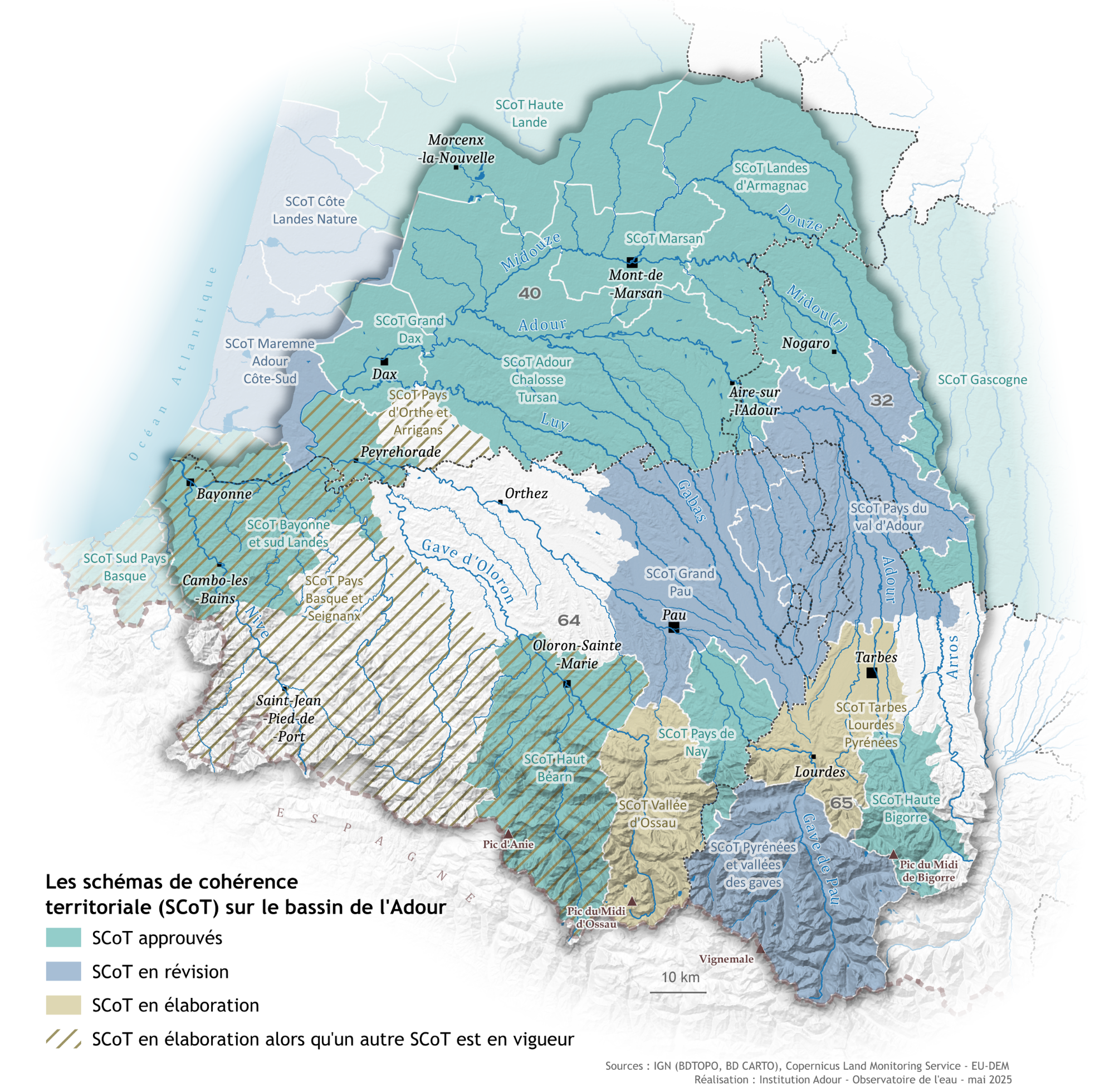 Sur le bassin de l’Adour, l’ensemble du territoire est couvert par des SCoT, excepté sur les communautés de communes du Béarn des Gaves, de Lacq-Orthez, des Coteaux du val d’Arros et du Pays de Trie et du Magnoac. Pour qu’un SCoT entre en vigueur et soit opposable, il existe au préalable une phase d’élaboration qui démarre lors de l’arrêté de périmètre du SCoT et se prolonge jusqu’à son approbation. Ainsi, sur le bassin de l’Adour, certains SCoT sont en phase d’élaboration et ne sont pas encore applicables. De même, afin d’être en adéquation avec la réalité du territoire et l’évolution des réglementations en vigueur, le document, une fois approuvé, peut être amené à être modifié (procédure simple) ou révisé. Dans ce dernier cas, il s’agit d’une procédure plus longue qui conduit à revoir l’ensemble du projet de développement de la collectivité.