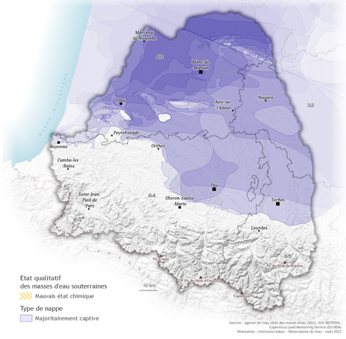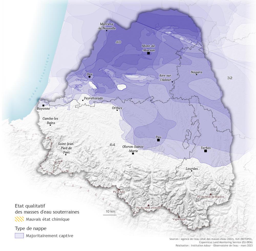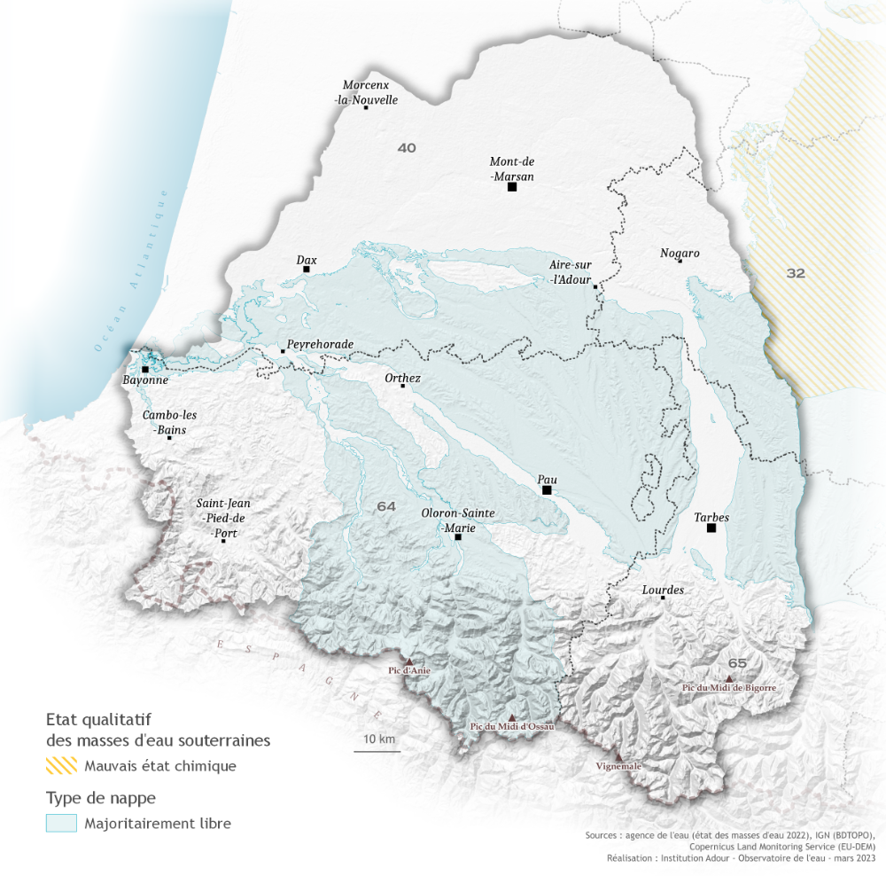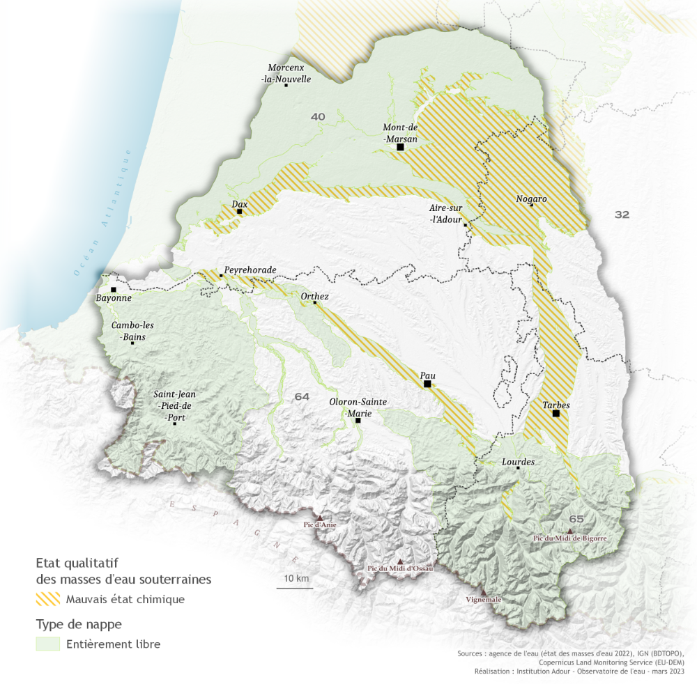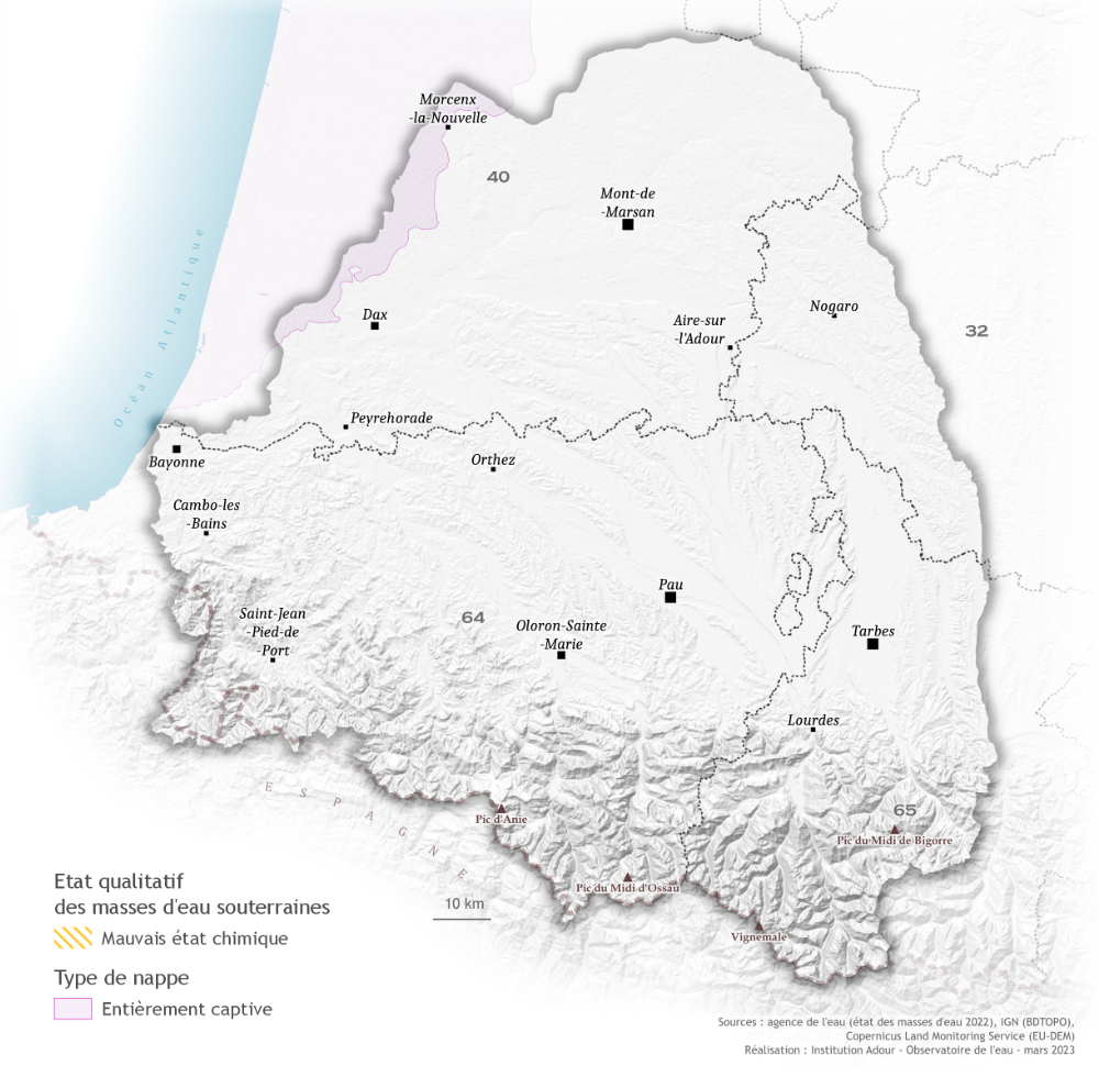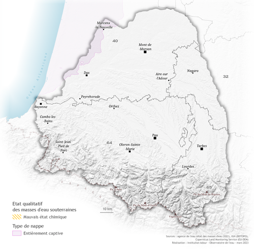 Pour les masses d'eau souterraines, la qualité est évaluée à partir de leur l'état chimique. Au niveau du bassin de l'Adour, les masses d'eau souterraines en mauvais état sont des nappes entièrement libres. Les nappes captives, séparées de la surface par une couche imperméable sont, elles, en bon état.