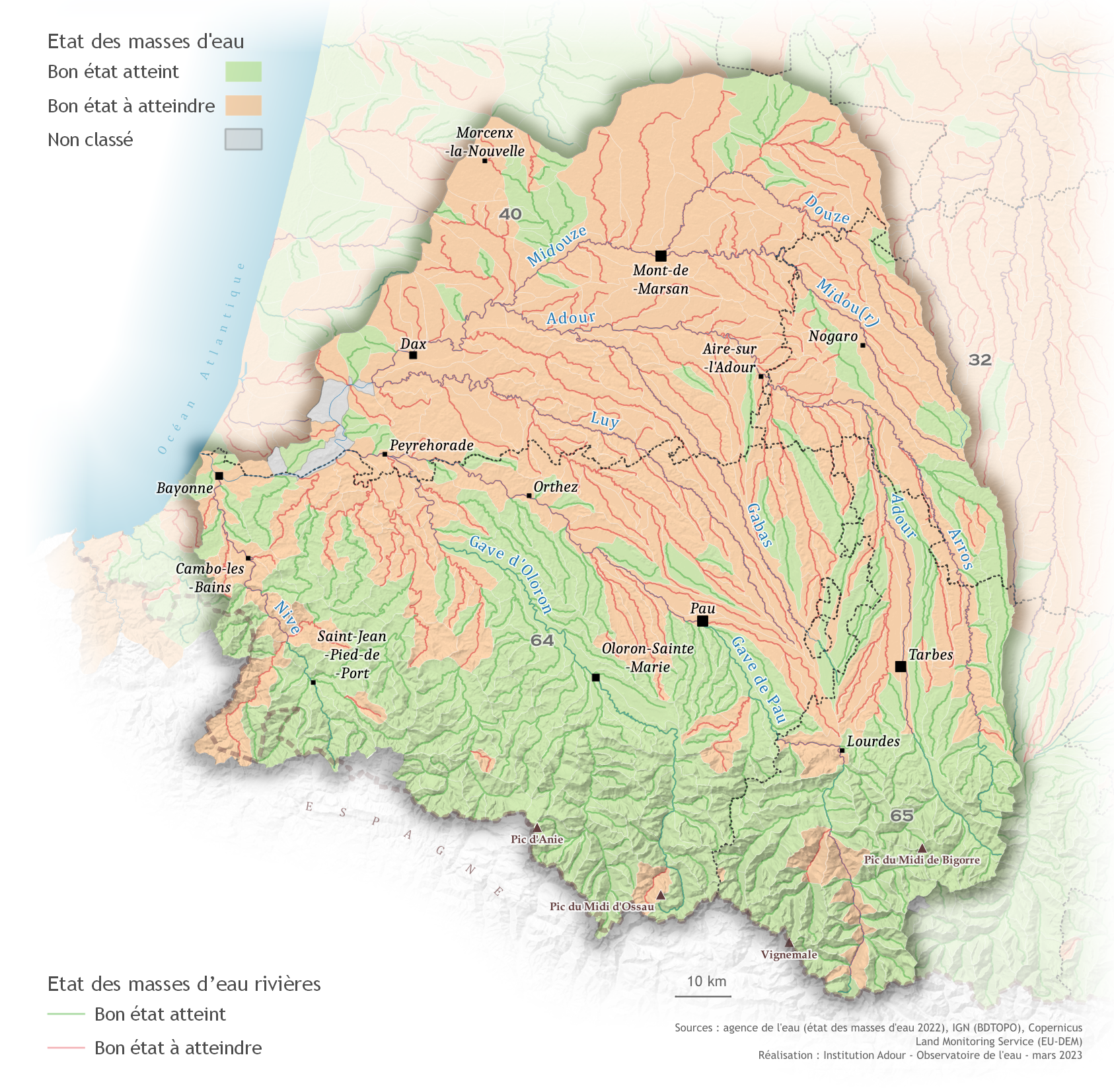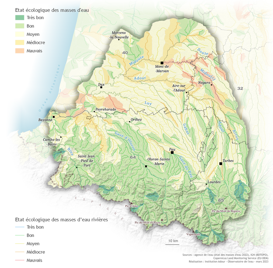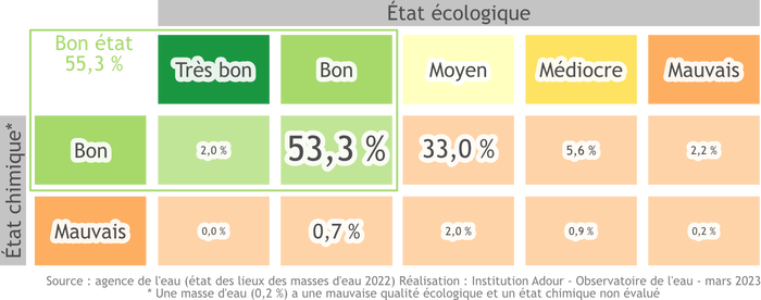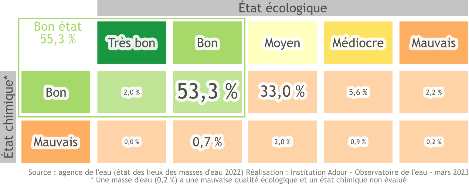 Le bon état qualitatif pour les eaux superficielles se définit par la combinaison d'un bon état chimique et d'un bon à très bon état écologique. Plus de 55 % des masses d'eau superficielles du bassin de l'Adour présentent un bon état (49 % pour le bassin Adour-Garonne).