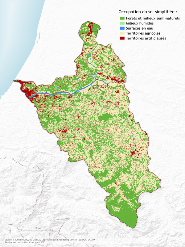 Plusieurs espaces artificialisés se distinguent tels que l'aire urbaine de Bayonne ainsi que le secteur de Peyrehorade et Oeyregave. Plus ponctuellement, d'autres bourgs urbains comme celui de Bidache, Saint-Palais, Hasparren ou encore de Saint-Just-Ibarre sont répartis le long du réseau hydrographique. Ce tissu urbain est caractérisé par une densité importante d'habitat et de population (8% du de la surface du territoire) et représente des enjeux importants pour la santé humaine.