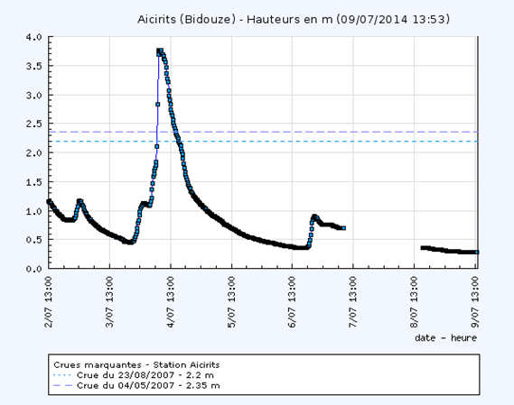 De tels niveaux d'eau n'ont plus été observés sur le sous bassin-versant de la Bidouze jusqu'à la crue de juillet 2014.