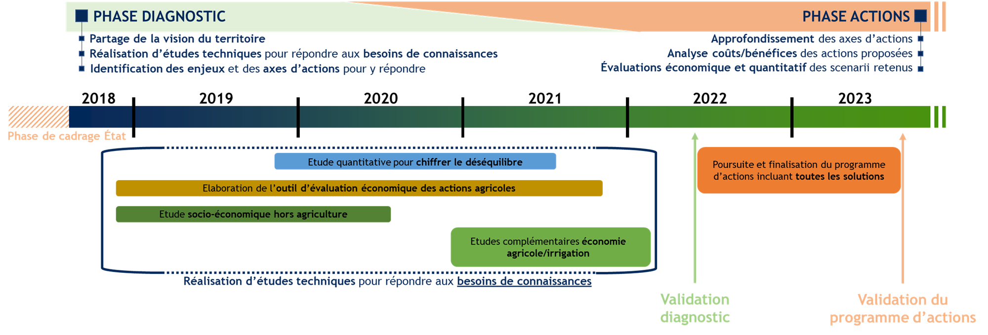 L'étude permet de déterminer le volume à résorber pour retrouver un équilibre quantitatif au regard de la situation actuelle et d’une situation projetée avec les conditions climatiques de 2050. L'étude permet ainsi de mesurer les efforts à fournir à court et long terme pour atteindre l'objectif du projet de territoire. Pour répondre au mieux aux attentes, cette étude est menée en interaction avec la co-construction du diagnostic partagé.