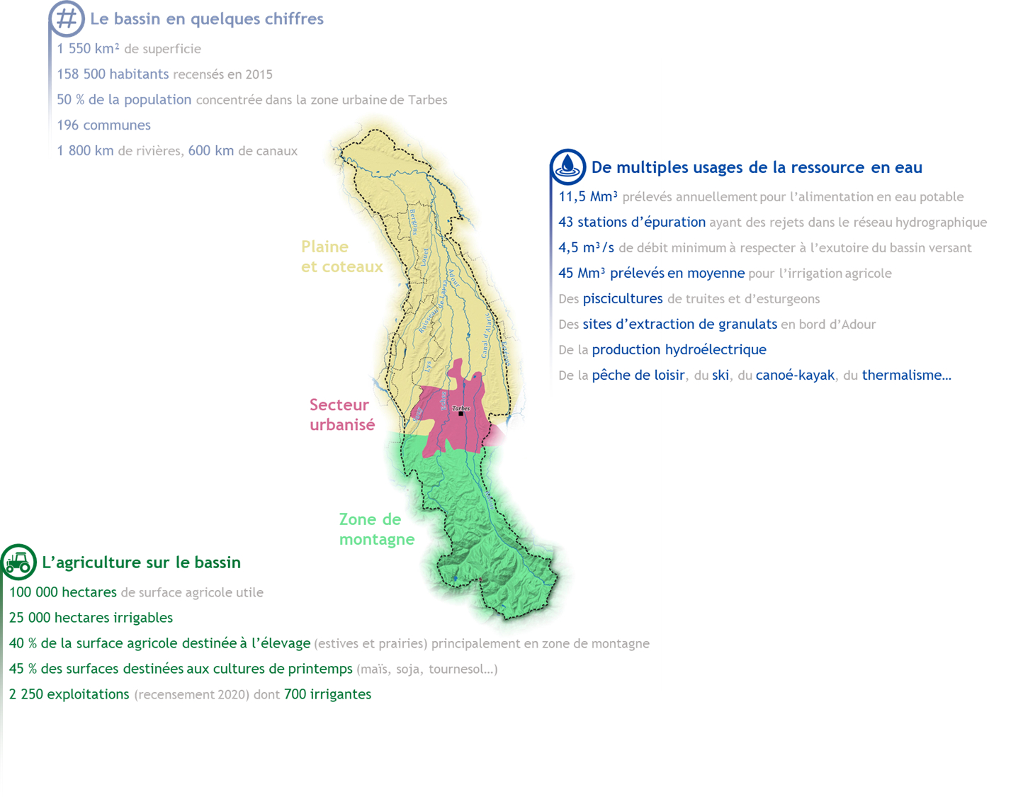 Le territoire du projet présente une variété d'usages importante liée aux spécificités des différents sous-bassins (topographie, réseau hydrographique, etc.). Outre les usages prioritaires que constituent l'alimentation en eau potable, la salubrité publique et les milieux naturels, de multiples usages préleveurs (agriculture, industries, tourisme) et non préleveurs sont présents sur le territoire et ont des attentes variées vis-à-vis de la disponibilité en eau. Ces attentes peuvent porter sur la quantité de ressource disponible (en volume ou en débit) ou sur la régularité de la ressource et être influencées par d'autres facteurs, comme la qualité de l'eau et le bon fonctionnement des milieux.