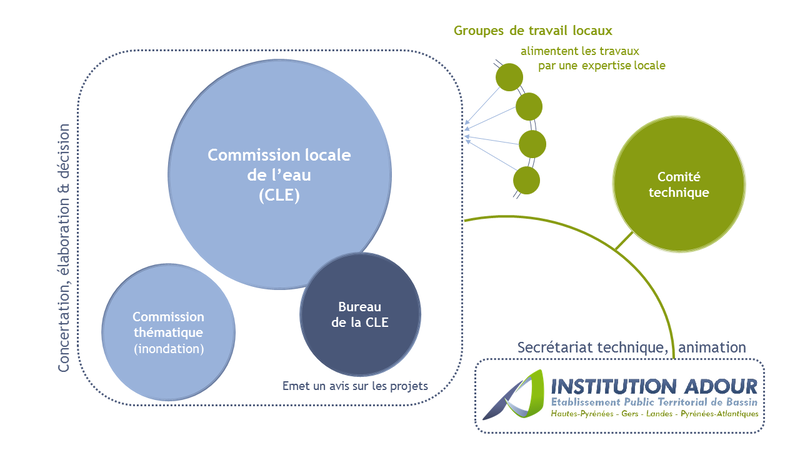 La commission locale de l’eau (CLE) est l’organe central de l’élaboration et du suivi de la mise en œuvre du SAGE. Elle se réunit en séance plénière une à deux fois par an. Pour ses travaux, elle s’appuie sur diverses instances internes et externes : le bureau de la CLE, les commissions, le comité technique, la structure porteuse et l’équipe d’animation.