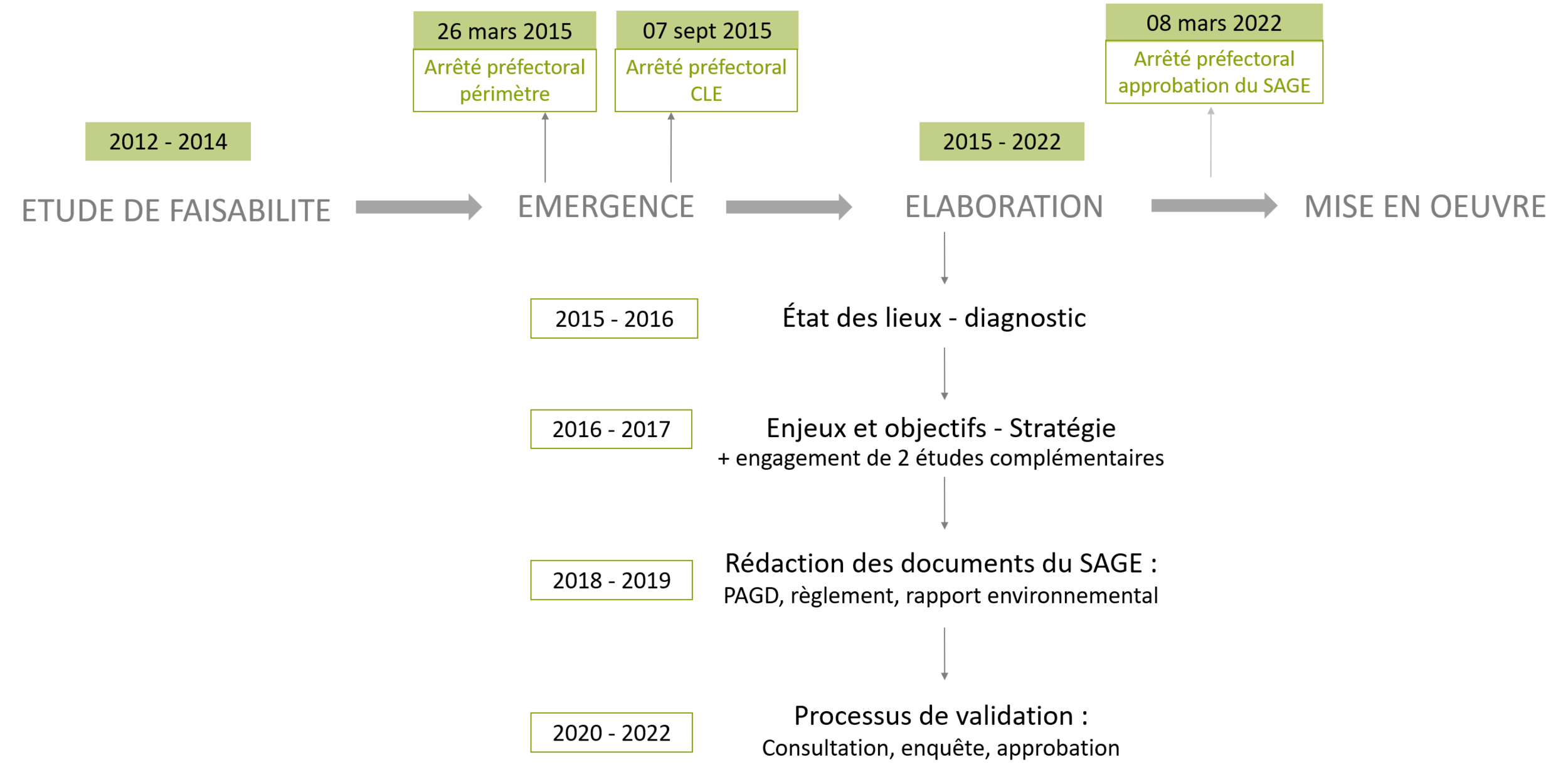 Le processus d'élaboration d'un SAGE s'échelonne sur plusieurs étapes, des premières réflexions sur sa faisabilité en 2012-2014, en passant par son émergence en 2015, et jusqu'à la validation définitive de ses documents constitutifs en 2022.